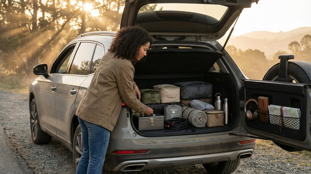 Muitos viajantes cometem o erro de colocar tudo no porta-malas e, durante o trajeto, percebem que precisam de algo inacessível. Dentro da cabine, você deve ter uma bolsa ou organizador com itens de uso imediato. Isso inclui óculos de sol, carregadores de celular (cabos e adaptadores veiculares), lenços de papel, álcool em gel e carteira com documentos (CNH e documento do veículo). Ter dinheiro em espécie trocado para pedágios (caso não tenha tag automática) também é essencial para evitar estresse nas praças de cobrança.